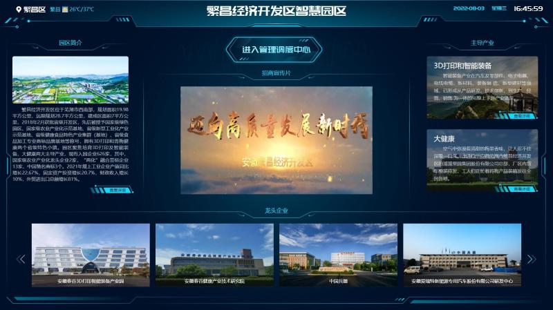 充分運(yùn)用大數(shù)據(jù)、區(qū)塊鏈、物聯(lián)網(wǎng)、數(shù)字孿生等新興技術(shù),對園區(qū)綜合數(shù)據(jù)進(jìn)行采集、處理、分析,利用LED大屏、移動(dòng)終端等設(shè)備,接入顯示各瞭望點(diǎn)和監(jiān)控端等視頻數(shù)據(jù),構(gòu)建園區(qū)統(tǒng)一管理調(diào)度中心,實(shí)現(xiàn)園區(qū)一張圖管理。主要包含園區(qū)總覽一張圖、黨建一張圖、產(chǎn)業(yè)招商一張圖、項(xiàng)目監(jiān)管一張圖、經(jīng)濟(jì)運(yùn)行一張圖等內(nèi)容。同時(shí)預(yù)留數(shù)據(jù)接口,實(shí)現(xiàn)與智慧繁昌平臺(tái)的對接,支持將數(shù)據(jù)及相關(guān)模塊接入智慧繁昌運(yùn)營中心。